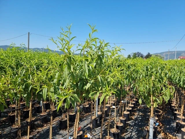 De Perzik als halfstam (Prunus persica ‘Redhaven’) produceert een uitstekende gele perzik met zeer geurig en geel sappig vruchtvlees, De vruchten rijpen in augustus.